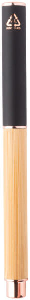 Bambuszból és újrahasznosított alumíniumból készült rollertoll gumírozott kupakkal és rózsaarany részletekkel. Speciális bevonattal rendelkezik a rózsaarany színű tükörgravírozáshoz. Kék tollbetéttel.