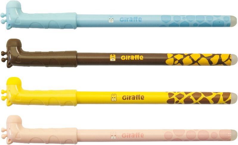 Műanyag, zsiráf mintás tolltest. Kupakos kivitel. A zsiráf formájú kupakon és a tollvégen található radírral a roller írásképe nyomtalanul kitörölhető.